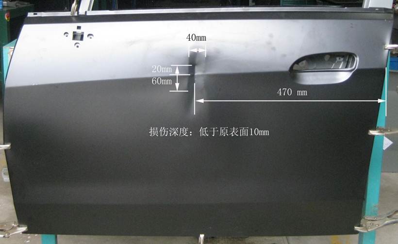 2013年車身修復(fù)大賽受損門板修復(fù)項(xiàng)目技術(shù)方案的補(bǔ)充說明 2013-05-16 19093 2013年車身修復(fù)大賽受損門板修復(fù)項(xiàng)目技術(shù)方案的補(bǔ)充說明 1、受損門板項(xiàng)目的受損位置及尺寸圖片、作業(yè)要求(1)作業(yè)要求在40分鐘內(nèi),對雪佛蘭新賽歐左前門外板上的長80mm,寬40mm,深10mm的條形凹陷(漆膜已破壞)進(jìn)行修復(fù),凹陷損傷穿過車身線。