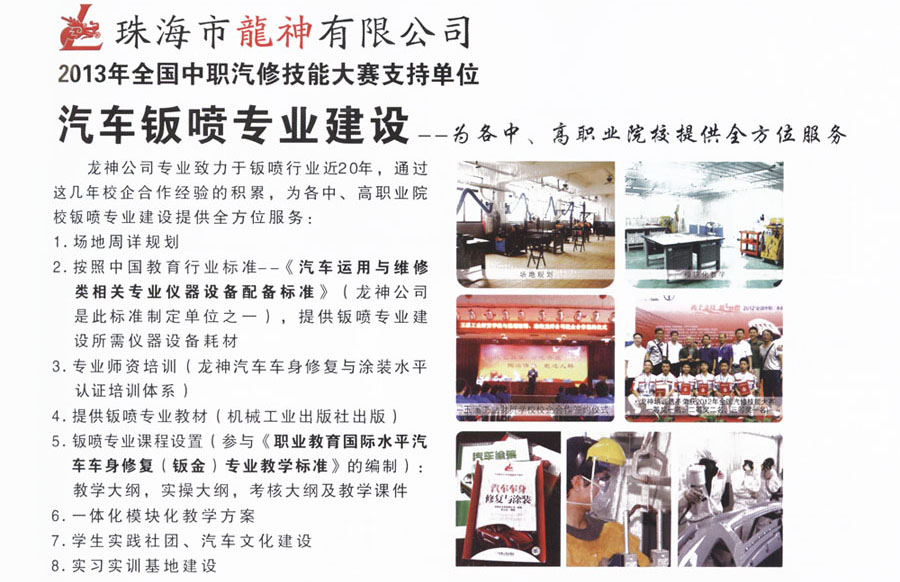 龍神汽車車身修復(fù)與涂裝 水平認(rèn)證培訓(xùn)體系 2013-06-03 25314 龍神公司專業(yè)致力于鈑噴行業(yè)近20年,通過這幾年校企合作經(jīng)驗(yàn)的積累,為各中、高職業(yè)院校鈑噴專業(yè)建設(shè)提供全方位服務(wù)。