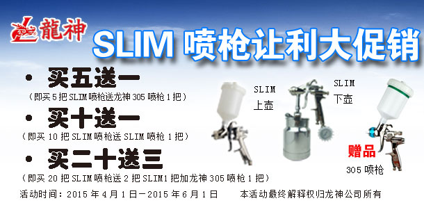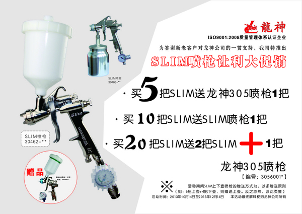 2014年2月份SLIM噴槍促銷方案 2014-02-14 11113 一、 主題“春雷。讓利行動”SLIM噴槍讓利大促銷二、 活動時間1、 起始時間:2014年02月15日至2014年4月15日2、 時長:二個月三、 活動內容(活動方案)1)買5把SLIM送 龍神305噴槍[編號3056001*]一把2)買10把SLIM送1把SLIM3)買20把SLIM送2把SLIM+送龍神305噴槍[編號3056001*]一把活動期間SLIM上下壺噴槍的贈送方式為:以多贈送原則(如:買6把上壺+4把下壺,贈送上壺。反之亦然,以此類推。)
