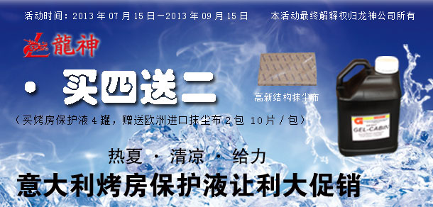 "熱夏 清涼 給力" 意大利烤房保護液讓利大促銷! 2013-07-16 25383 "熱夏 清涼 給力" 意大利烤房保護液讓利大促銷!活動時間:2013年07月15日至2013年09月15日。 時長:共計2個月